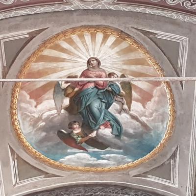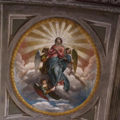 Le médaillon de l'Assomption (voûte du chœur): le thème retenu ici par Novellini correspond à la volonté des commanditaires de la paroisse de réaliser un décor monumental glorifiant la Vierge de l'Assomption dont l'église porte la titulature.
