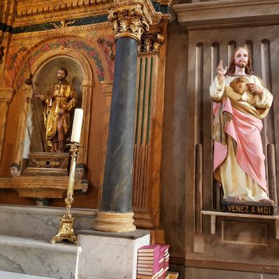 Deux autels dans chacune des travées latérales sont voués, ceux de droite à Saint Roch et à l'Assomption dont la belle statue de bois sculpté est classée au mobilier national; ceux de gauche à Saint Antoine Abbé, patron de la Confrérie qui porte son nom et à la nativité dont la statue dorée a été offerte par l'impératrice Eugénie; au dessus du banc des marguillers se trouve un beau tableau sans doute de l'époque napolitaine du 17è siècle représentant le miracle de Hugo de Lincoln.