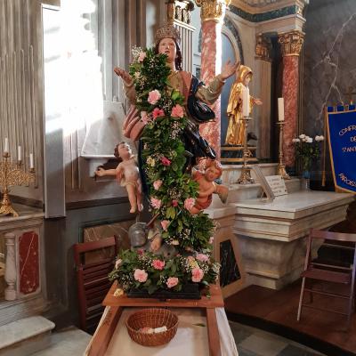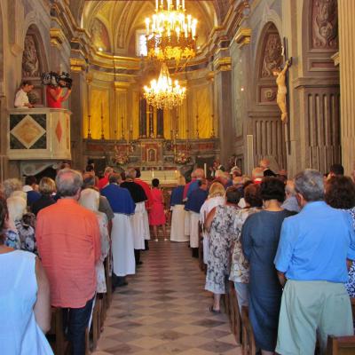 L'église est dédiée à Sainte Marie, patronne du village et au Sacré Coeur depuis 1901. C'est un édifice baroque tardif, d'allure élégante de dimension imposante. Le décor intérieur en trompe l'oeil de style néo classique, effectué en 1879 par le peintre Novellini est remarquable par sa sobriété et son bon goût.Le pavement en marbre a été posé en 1889.