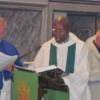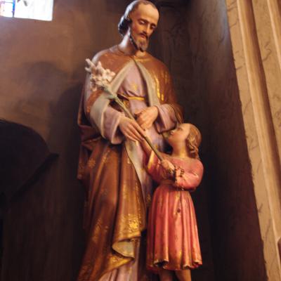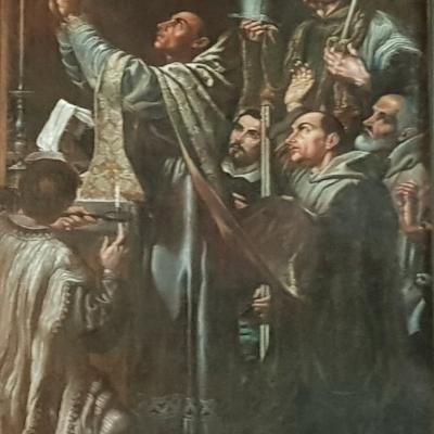 Saint Hugues de Lincoln: saint Hugues de Lincoln est représenté de profil devant l'autel, levant les bras et tenant l'Enfant Jésus auréolé de lumière. Derrière lui des personnages agenouillés lèvent les yeux vers l'apparition. à l'extrême droite du tableau un personnage tient la crosse et la mitre qui sont les insignesépiscopaux de saint Hugues, évêque de Lincoln.