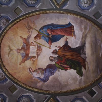 On remarque les peintures des quatre évangélistes dans le choeur, puis les cartouches de la voûte, l'un représentant l'Assomption de la Sainte Vierge, l'autre la réconciliation des deux églises.