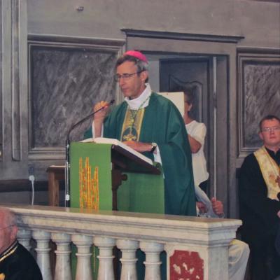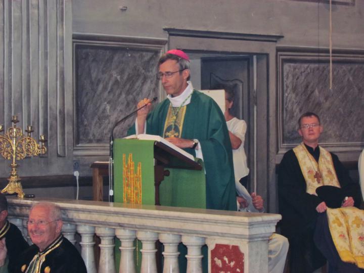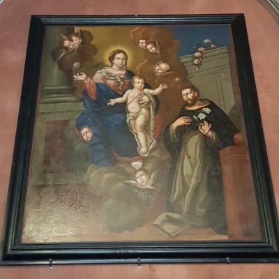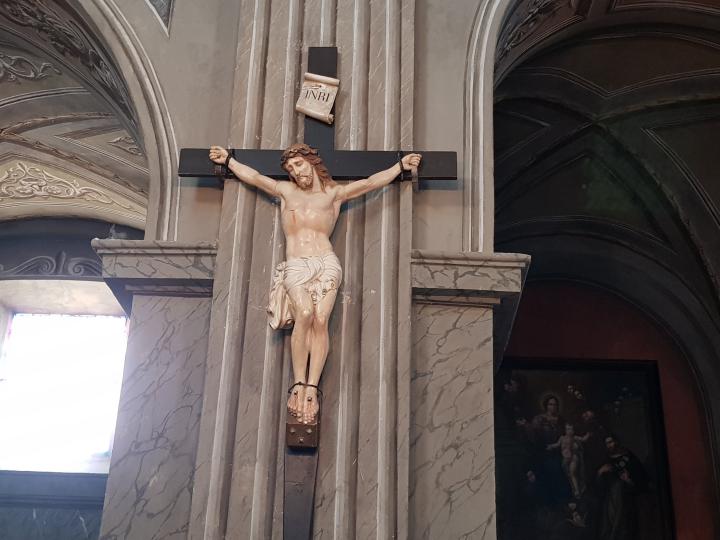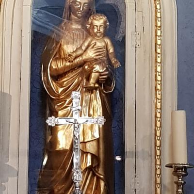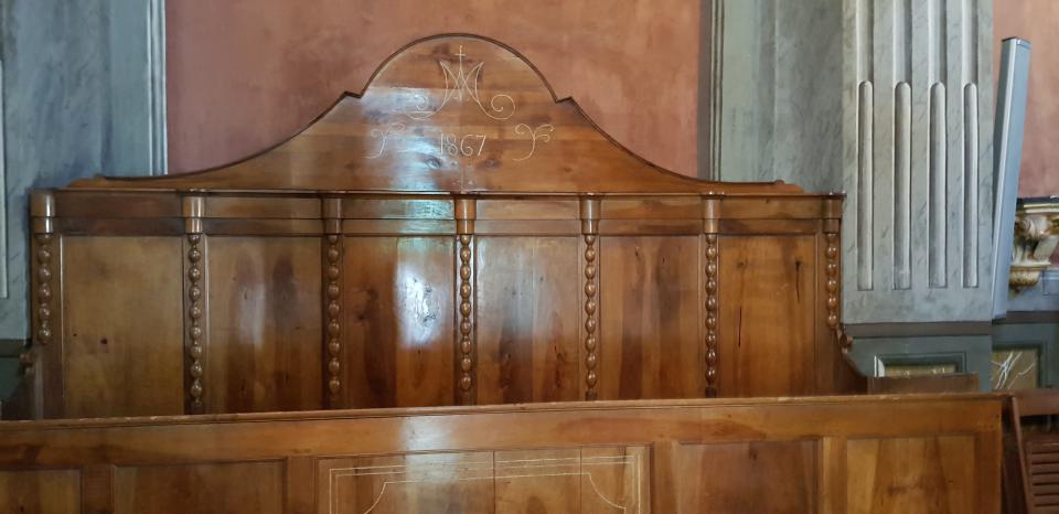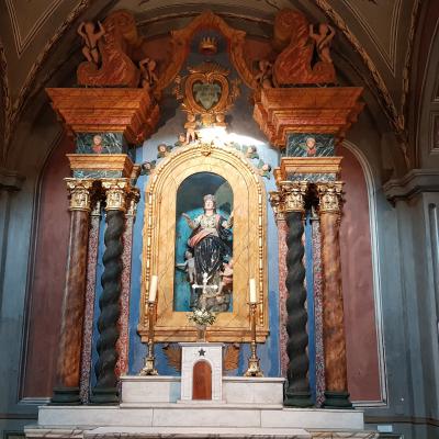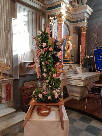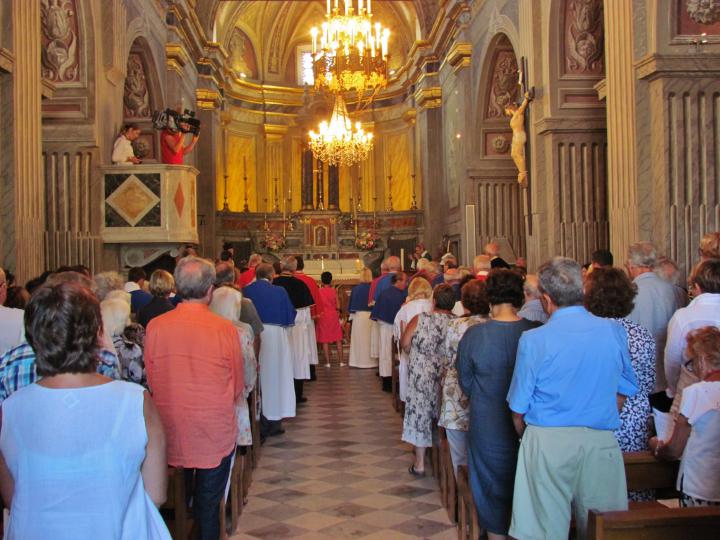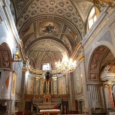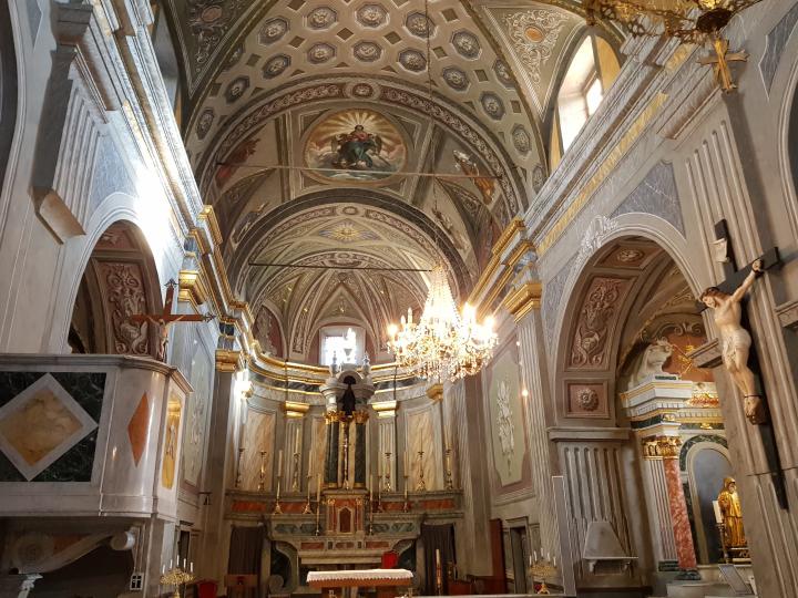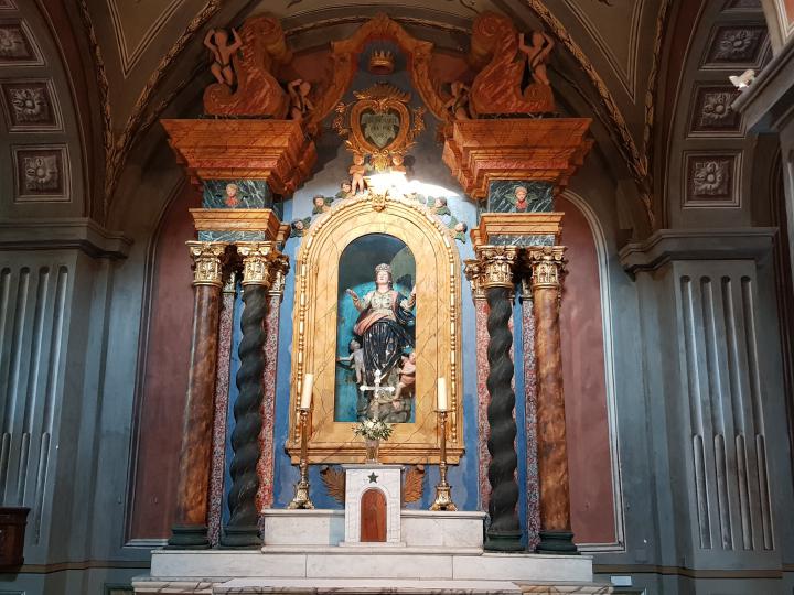 L'église est dédiée à Sainte Marie, patronne du village et au Sacré Coeur depuis 1901. C'est un édifice baroque tardif, d'allure élégante de dimension imposante. Le décor intérieur en trompe l'oeil de style néo classique, effectué en 1879 par le peintre Novellini est remarquable par sa sobriété et son bon goût.Le pavement en marbre a été posé en 1889.