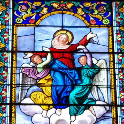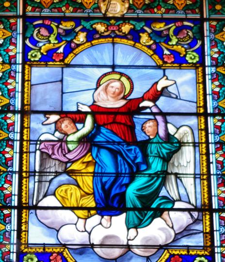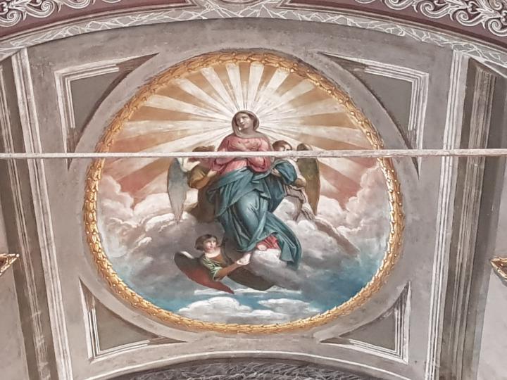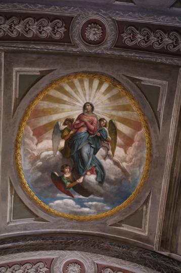 Le médaillon de l'Assomption (voûte du chœur): le thème retenu ici par Novellini correspond à la volonté des commanditaires de la paroisse de réaliser un décor monumental glorifiant la Vierge de l'Assomption dont l'église porte la titulature.