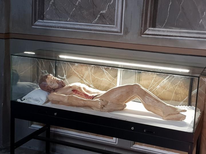 L’autel principal est entouré d’une colonnade en marbre de Carrare.Le tabernacle en bois finement sculpté est couronné d'un baldaquin à colonnettes corinthiennes surmonté par le symbolique pélican se sacrifiant en s’offrant en nourriture à ses enfant.