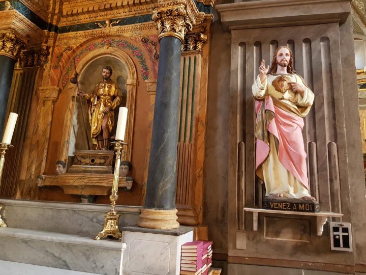 Deux autels dans chacune des travées latérales sont voués, ceux de droite à Saint Roch et à l'Assomption dont la belle statue de bois sculpté est classée au mobilier national; ceux de gauche à Saint Antoine Abbé, patron de la Confrérie qui porte son nom et à la nativité dont la statue dorée a été offerte par l'impératrice Eugénie; au dessus du banc des marguillers se trouve un beau tableau sans doute de l'époque napolitaine du 17è siècle représentant le miracle de Hugo de Lincoln.