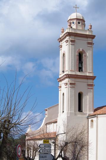 C'est l'église Sainte-Marie de Piana (Santa Maria Assunta) à la façade supérieure scandée de pilastres plats et couronnée d'un fronton triangulaire surmontée de son campanile.