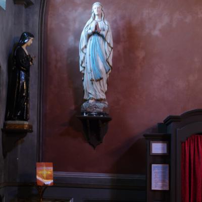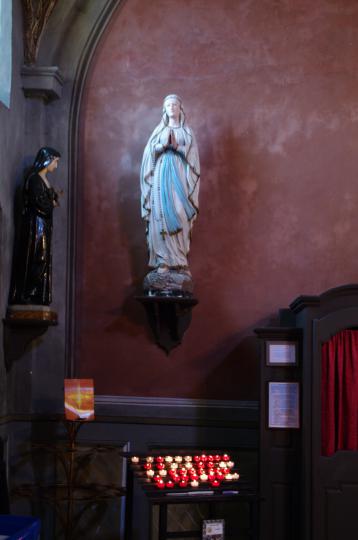 L'inscription surmontant la porte d'entrée signifie: " Si tu cherches des satisfactions et un réconfort dans les heures difficiles, entre ici prier le coeur de la Mère de Dieu ".