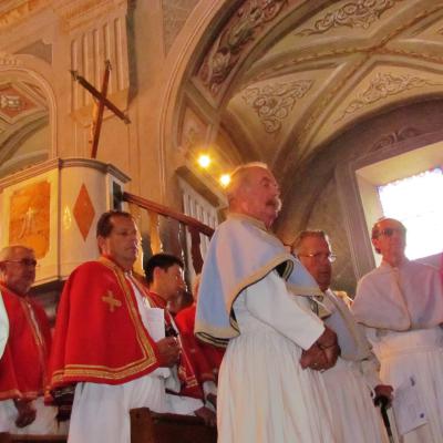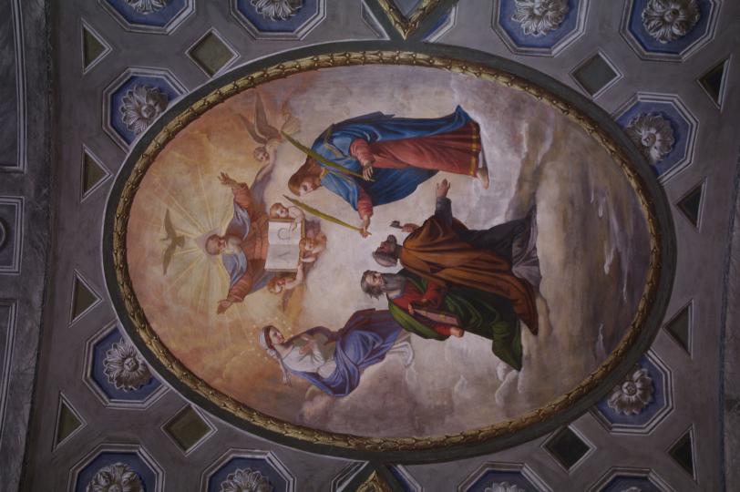 On remarque les peintures des quatre évangélistes dans le choeur, puis les cartouches de la voûte, l'un représentant l'Assomption de la Sainte Vierge, l'autre la réconciliation des deux églises.