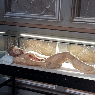 Saint Hugues de Lincoln: saint Hugues de Lincoln est représenté de profil devant l'autel, levant les bras et tenant l'Enfant Jésus auréolé de lumière. Derrière lui des personnages agenouillés lèvent les yeux vers l'apparition. à l'extrême droite du tableau un personnage tient la crosse et la mitre qui sont les insignesépiscopaux de saint Hugues, évêque de Lincoln.