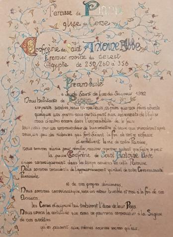 Nous, habitants de Piana et du Canton des Deux-Sevi, croyants sincères, mais ni meilleurs ni pires que nos frères absents, quelques uns parmi nous, participants aux Sacrements de l'Eglise, mais d'autres encore dans l'impossibilité de le faire, tous unis par un commun désir de transmettre à ceux qui viendront après nous, un peu des richesses qui fortifièrent la foi de notre enfance et embellirent la vie de notre Paroisse, nous sommes réunis pour réveiller, ranimer, repenser, autant que faire se peut, la pieuse Confrérie de St Antoine Abbé, érigée canoniquement, dans les temps anciens en cette Paroisse.